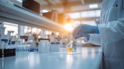 Scientist in lab coat pouring chemical into test tube in modern lab