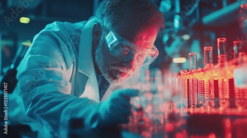 Scientist in Lab Examining Test Tubes, Experimenting with Liquids, Science & Research, Laboratory Work.