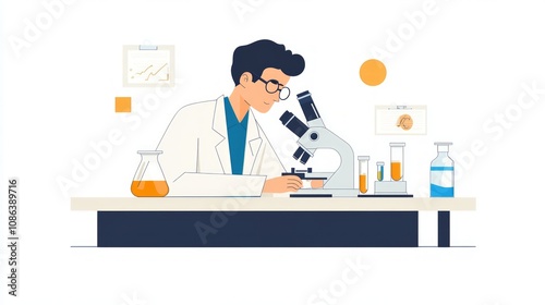 Scientist in Lab with Microscope and Test Tubes