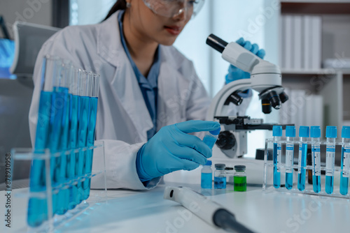 scientist is using microscope in laboratory, chemical researcher works in chemistry with concentration, chemist is conducting a science experiment using a microscope to test experimental substances
