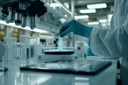 Scientist using a pipette in a sterile laboratory representing the precise research and study in biotechnology and chemical analysis within an advanced laboratory environment