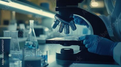 Scientist using microscope in lab, examining samples, research background