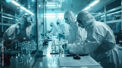 Scientists in a high-tech lab conducting experiments in protective suits, ensuring safe and precise research in a sterile environment.
