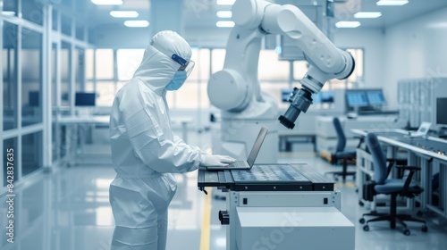 scientist, specialist, men at work, walking, industrial, factory, laptop, computer, medicals, production, man, machine, coverall, laboratory, innovation, engineer, professional, technician, business, industry, facility, research, health, protective, medicine, using, sterile, job, work, operator, connected, science, pharmaceutical, face mask, clean room, portrait, male, vaccine, cyberspace, manufacturing, omicron, technology