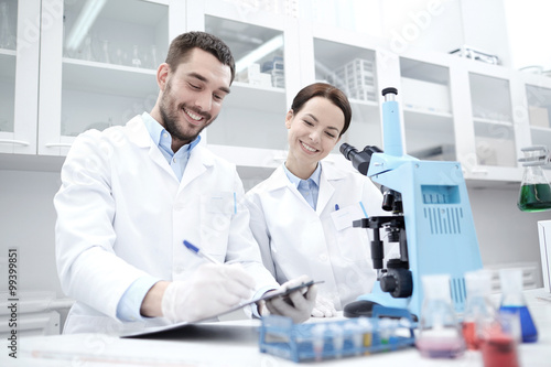 scientists with clipboard and microscope in lab