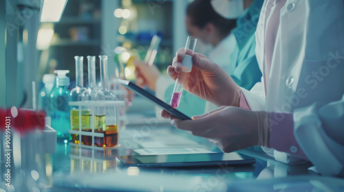 Scientists working in a modern laboratory, performing experiments with test tubes and digital devices, highlighting the fusion of technology and science.