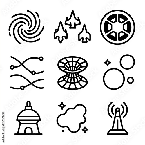 galaxy, icon, outline, icon, set, science, fiction, galaxy, spiral, warp, route, space, fleet, silhouette, galactic, empire, emblem, interstellar, line, wormhole, gateway, planet, flocked, alien, civilisation, structure