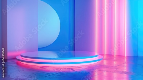 Sci-fi product podium with a cyberpunk aesthetic in an empty room, set against blue and pink backgrounds. 3D rendering.