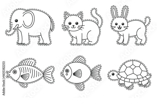 elephant, cat, rabbit, fish, turtle, animal, pet, wildlife, outline, cut-out, black-and-white, illustration, drawing, simple, cartoon, children, education, domestic animals, isolated, white background