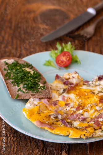 egg, breakfast, meal, fresh, tasty, healthy, traditional, fried, food, cooked, vegetable, lunch, omelet, scrambled, omelet, yellow, egg, fried egg, background, light, dish, closeup, stone, delicious, greener, cookery, topview, scrambled eggs, green, plank, wooden, wood, fork, knife, salad, tomatoes, chives, butter, bread, organic, yolk, morning, simple, appetising, nobody, parsley, ham