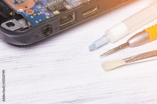 Screwdrivers and disassembled computer