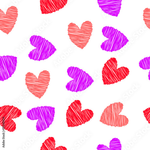 Scribbled red, pink and purple hearts, seamless pattern