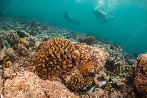Scuba divers swimming among colorful coral reef and tropical fish in clear blue water, Indian Ocean