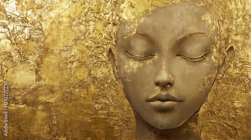 Sculptural representation of a serene face with gold leaf background showcasing tranquil expression and artistic craftsmanship