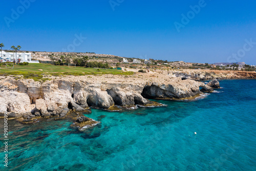Sea caves in Ayia Napa resort town, Cyprus, view from drone
