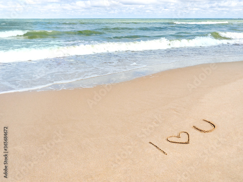 Sea coast with soft surf. Words I LOVE YOU and heart symbol written on sandy beach. Vacation on seaside.