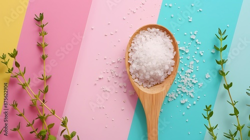 sea salt on a bamboo spoon and fresh organic thyme isolated on colorful background