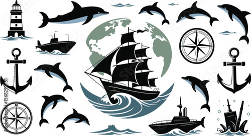 "Sea, Ship, and Wave Silhouette Vector Icon Set for Nautical and Marine Themes"