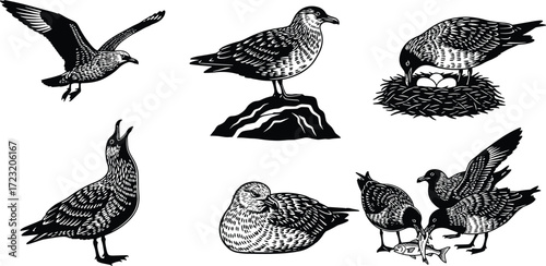 Seabird gull silhouettes in flight, nesting with eggs, feeding fish, perched on rock, coastal wildlife illustration, black and white design