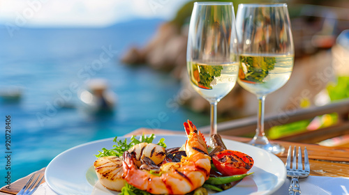 seafood dinner on a table with a seaside view, including grilled shrimp, scallops, a side of vegetables, and a glass of white wine