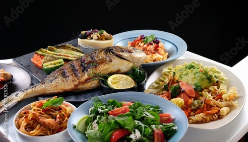 grilled fish, seafood, meal, dinner, food, cookery, delicious, tasty, fresh, healthy, eatery, salad, pasta, side dish, lemon, herb, vegetable, tomatoes, plate, table, white, black, blue, food photography