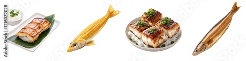 Seafood isolated collection. Fresh seafood assortment featuring grilled fish, sushi, and elegantly plated dishes garnished with herbs and vegetables.