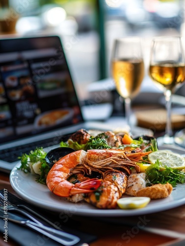 seafood, lunch, laptop, wine, cafes, eatery, dining, food, meal, delicious, healthy eating, shrimp, prawn, mussel, seafood, white wine, glass of wine, healthy lifestyle, gourmet food, fine dining, table setting, food photography, epicure, culinary, gastronomy, adventure, people, fitness