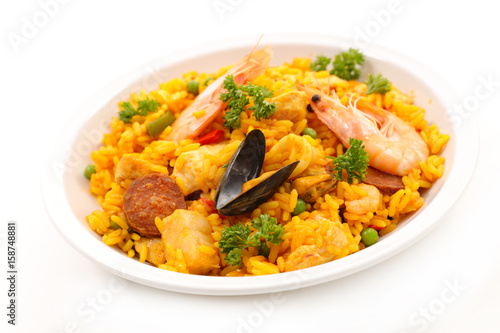 paella, spanish, seafood, crustacean, fish, prawn, cooked, cookery, gastronomy, food, rice, saffron, traditional, dish, cookery, dinner, lunch, meal, isolated, white, background, menu, eatery