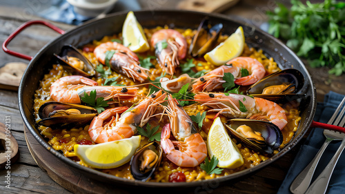 paella, seafood, pan, lemon, shrimp, spanish, food, cooking, dish, dinner, cookery, fish, epicure, vegetable