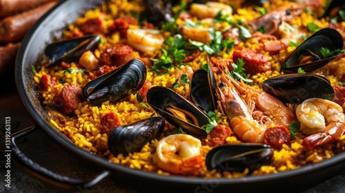 Seafood paella in a pan, cooking, gourmet food, close up, delicious, ready to eat, perfect for restaurant promotion