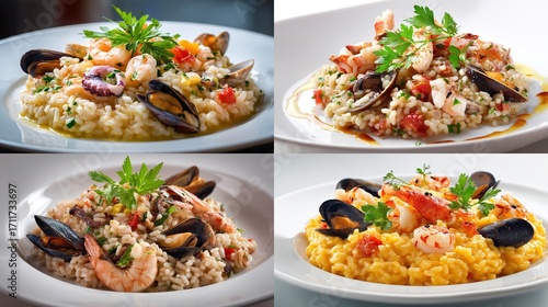 risotto, seafood, mussel, shrimp, clam, rice, plate, parsley, garnish, dish, meal, food, cookery, culinary, delicious, epicure, fresh, cooked, tasty, dinner, lunch, presentation, white, brown, yellow, eatery, italian, mediterranean, diet, nourishment, healthy, gastronomy, shell, ingredient, closeup, texture, vibrant, bright, appetence, serving, portion, square, collage, variety, elegant, sophisticated, prepared, deliciously