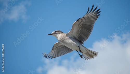 Seagull in Flight: A graceful seagull soars through a vibrant blue sky, its wings outstretched against a backdrop of fluffy white clouds.