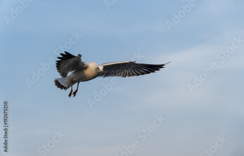 Seagulls flying at Bangpu recreation center in SamutPrakan Thailand. Seagulls were flying in blue sky background.