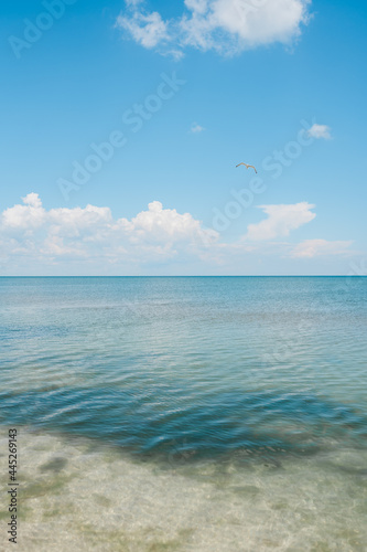 Seagulls flying in the sky. Seashone scene blue sea sky white clouds. Hot summer clear day