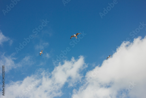 Seagulls in the blue sky over the English Channel. Background.