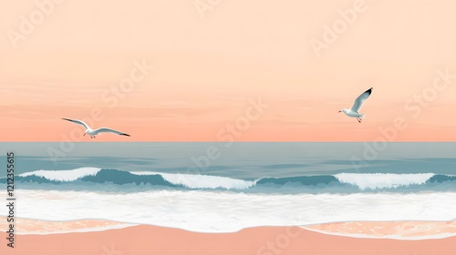 Seagulls soaring over calm ocean waves at sunrise coastal landscape digital art serene environment aerial view nature concept