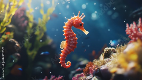 Seahorse swimming coral reef ocean background (1)