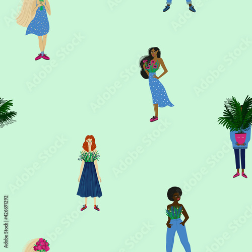 woman, girl, seamless, pattern, power, flower, ethnicity, illustration, vector, wallpaper, fabric, surface, wrapping, character, female, floral, summer, trendy, plant, lady, pot, feminist, asian, afro, american, skin, black, european, redhead, cartoon, colourful, race, standing, beautiful, fashion, feminine, print, design, people, graphic, drawing, native, blue, green