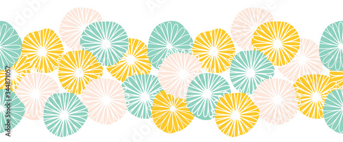 Seamless abstract flowers vector border. Bold florals red yellow pink teal white Scandinavian flat style repeating pattern. Botanical minimalistic doodle flowers line art style.