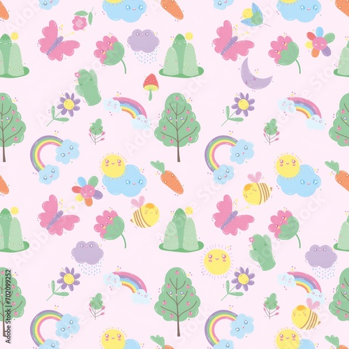 illustration, artwork, flower, seamless, tree, rainbow, nature, cartoon, vector, children, baby, garden, plant, cactus, pattern, design, wallpaper, art, set, icon, floral, pink, card, animal, decoration, bee, children, texture, spring, summer, element, drawing, textile, repeat, cute, beautiful, pastel, mountain, butterfly, forest, background, print, digital, comic, cloud, rain, smile