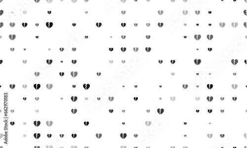 Seamless background pattern of evenly spaced black broken heart symbols of different sizes and opacity. Vector illustration on white background