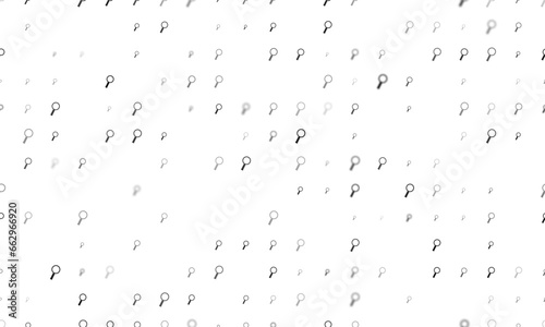 Seamless background pattern of evenly spaced black magnifier symbols of different sizes and opacity. Vector illustration on white background