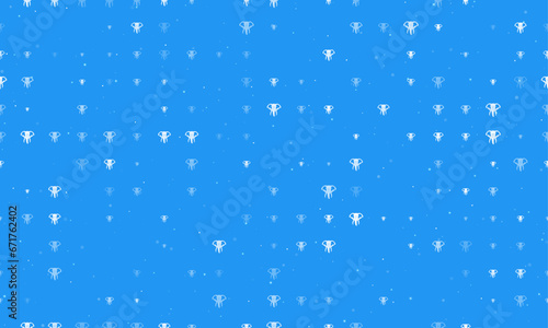 Seamless background pattern of evenly spaced white elephant heads of different sizes and opacity. Vector illustration on blue background with stars