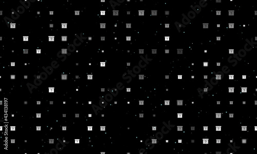 Seamless background pattern of evenly spaced white gift box with a question symbols of different sizes and opacity. Vector illustration on black background with stars