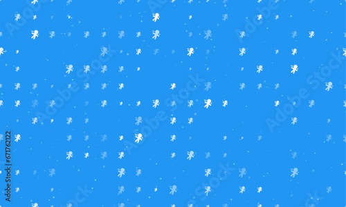 Seamless background pattern of evenly spaced white Voodoo Doll symbols of different sizes and opacity. Vector illustration on blue background with stars