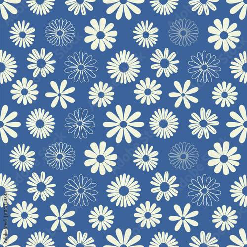 Seamless background with primitive childish floral pattern. Simple cute big dark blue and pink flowers in boho style. Baby wallpaper, print for banner, postcard, packaging, textile