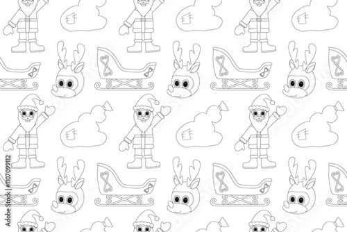 Seamless black and white coloring pattern featuring Santa Claus, reindeer, sleighs, and gift bags in a festive design.