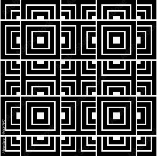 seamless black and white geometric maze pattern vector. Optical illusion design with bold lines and modern minimalist aesthetic, perfect for backgrounds, packaging, and textiles
