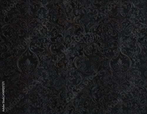 Seamless black gothic damask; swirling floral vines & intricate patterns , black and white, black, shadow