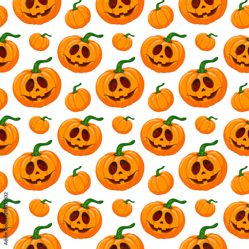 Seamless cartoon pattern of Happy Halloween face pumpkin. Autumn illustration. Cute print on white background for design textile, fabric, wrapping paper and scrapbooking